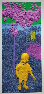 El Niño ocupa el centro de la composición, rodeado de espigas que evocan la Eucaristía y la fecundidad de la tierra. Su gesto abierto y su expresión luminosa convierten la escena en una invitación a entrar, a confiar y a contemplar lo divino revelado en la inocencia.